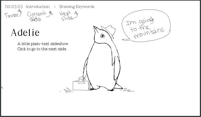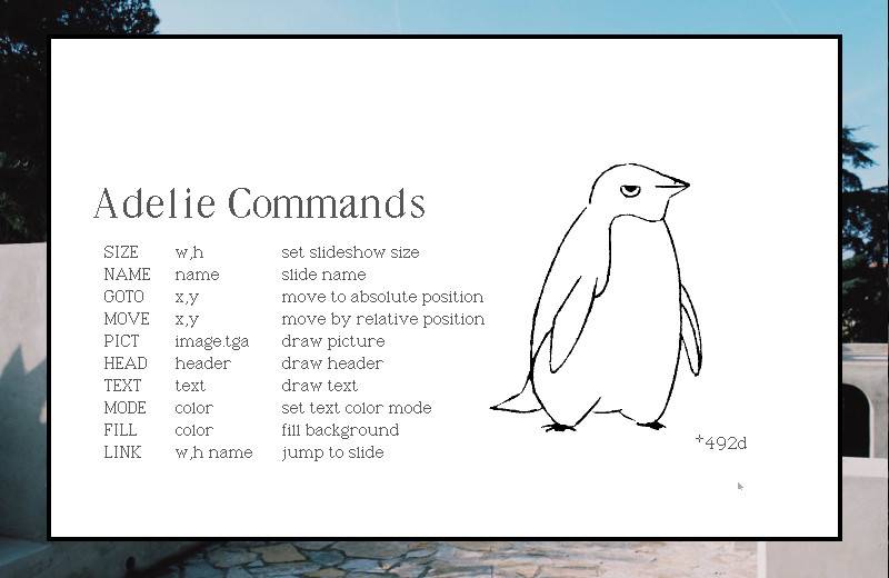 Adelie is a plain-text presentation tool and format. It is used to create slideshows with uxn. It features a handful of commands to quickly place text and images on slides, it can be operated with a keyboard, mouse or a game controller.