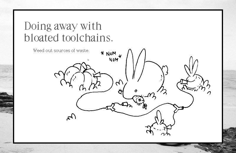 NAME Power solutions FILL 03 GOTO 04,03 PICT weeding.tga GOTO 04,04 HEAD Doing away with`bloated toolchains. GOTO 08,10 TEXT Weed out sources of waste.