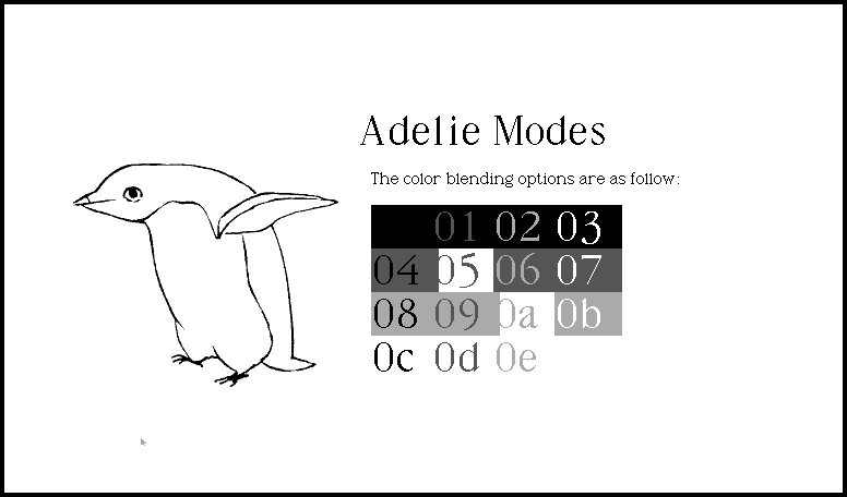 NAME Drawing Keywords FILL 03 GOTO 2c,08 MODE 0c PICT etc/adelie1.tga GOTO 04,0d HEAD Drawing Keywords WAIT 40 NAME Drawing: Mode GOTO 06,15 TEXT MODE MOVE 09,00 TEXT mode MOVE 09,00 TEXT set blending mode WAIT 08