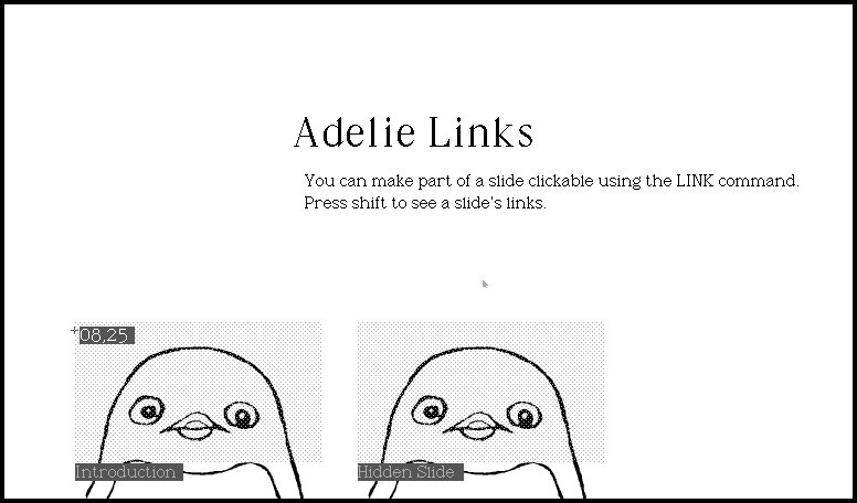 LINK expects a size. In the above example the two penguin faces act as two separate links, and the size of the clickable region is yours to determine (in the above example it covers the penguin's head). To link to a specific slide, enter that slide's name after the size. Press shift to see the clickable region and slide name, press shift again to make it disappear.