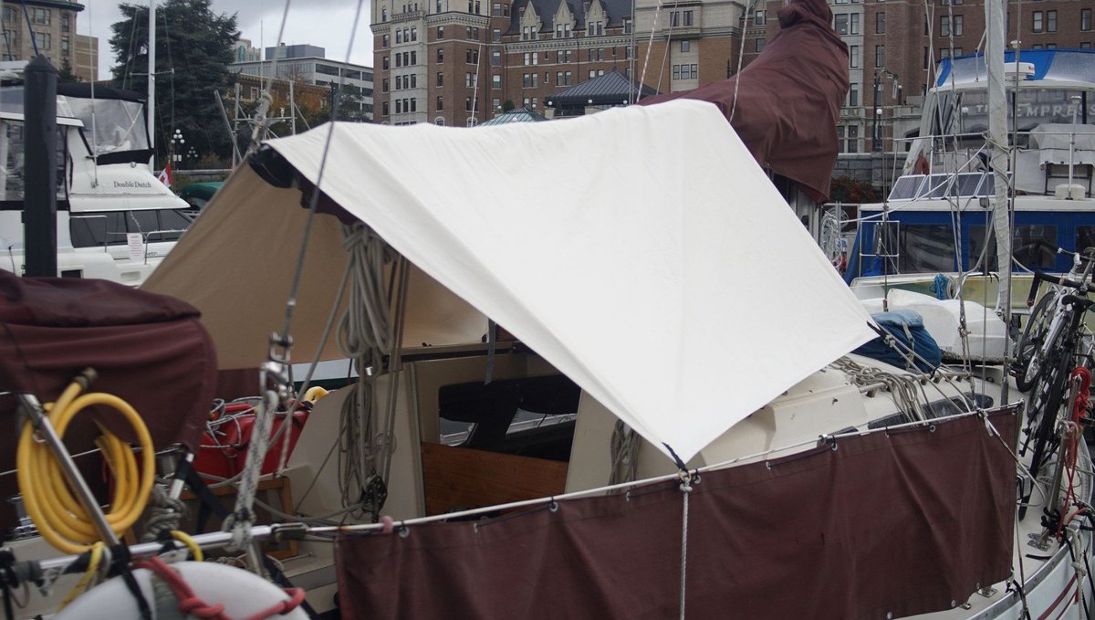 Fabric stores, like most businesses nowadays, suffer from lack of inventory due to a disruption in the supply chain. Jeunes Brothers in Victoria had many empty rolls. We walked in looking for canvas and found Sunforger's boat shrunk, a 100% 10 oz cotton marine canvas that is treated to repel both mildew and water.