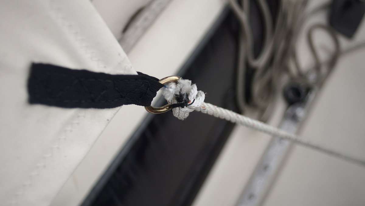 Added two rings to the centerfold of the tent at both ends so we can raise it without using a rope to support it. It works quite well and is easier to put up or to take down. One ring is tied to the mast with a rope, the other is hooked to the backstay using a bungee cord.