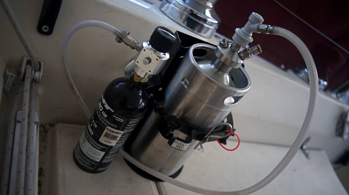 On a boat, keeping things secured is crucial, especially high-pressure items. We visited a local fire and safety equipment store, and asked if they sold brackets that could fit our keg. They sold us a heavy-duty bracket typically installed in moving vehicles. The item wasn't on their sell list, but he gave us a very fair price for it. We looked at the price of the bracket online afterward, it is typically sold for 90$CAD, we got it for 50$CAD.