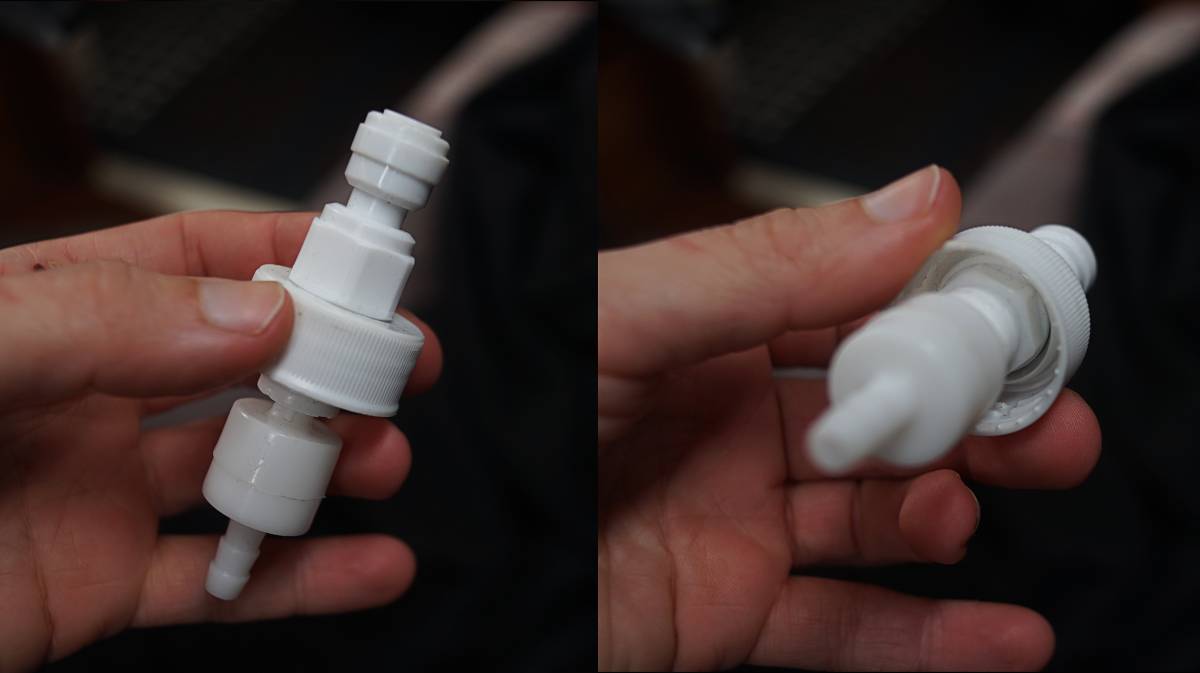 This is the custom bottle cap part that we found in Japan, a bit different than a carbonator bottle cap. It screws onto a soda bottle, and a vinyl tube is attached on the other end and leading back to the regulator.