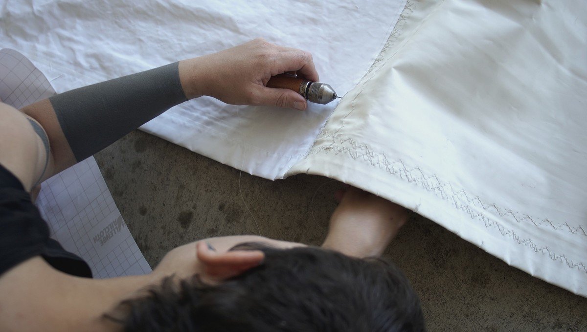 Applying the new material wasn't hard, because it has a sticky-backing. We hand-stitched it at first using our sewing awl, but 3 days later we were still on panel #2 with the whole sail left to do. Our backs were aching, we feared we would not survive this project.