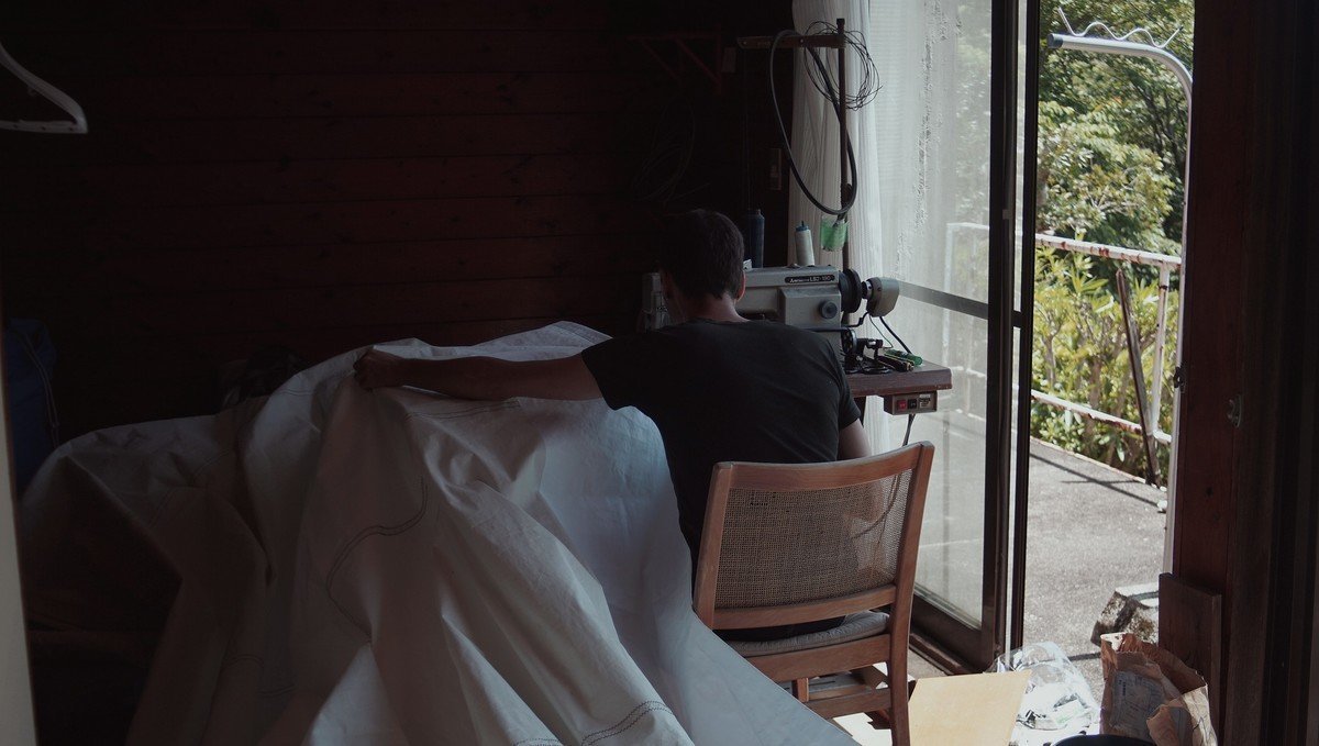 We had time to spare, so we worked on our Frankensail. We tried to do all of the work in the morning, because it got too hot there in the afternoon, even with all of the windows and doors open. Japanese summers are very, very hot.