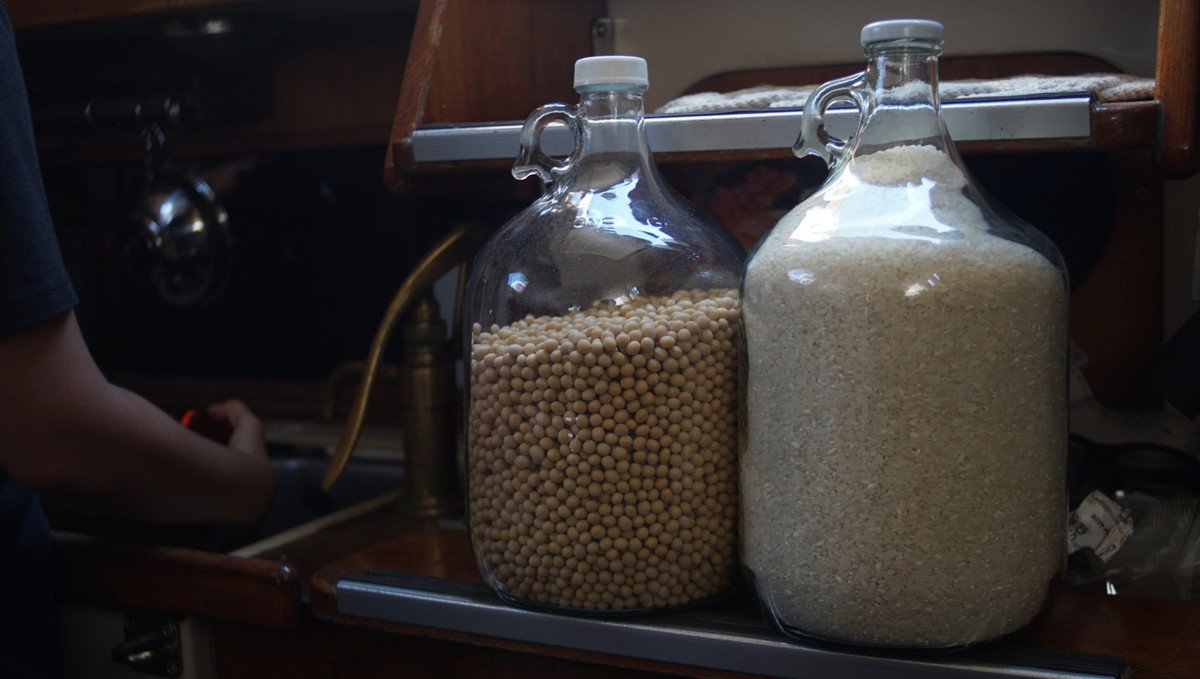 Dry foods: Dry food will keep for a long, long time on ocean passages. We keep a variety of dried grains, but also dried vegetables since we don't have refrigeration. Dried veg keep well in air-tight containers, their nutrients are preserved, and add variety to dishes. We add dry vegetables to boiling pasta to re-hydrate them. Dry mushrooms like shiitake, and kombu(algae) are a great base for broth. Our favorite dry foods are nori, kombu, dried potatoes(powdered or julienned), dried tomatoes(not in oil), raisins, dates, dried cranberries, TVP(textured vegetable protein), shitake, dry tofu(kouya doufu), rice cakes(Japanese kirimochi), radish, etc. We stock many types of whole grains (buckwheat, whole wheat berries, cornmeal, oat groats). Different grains offer different nutritional profiles, and meal options. To read more about how we store food, see food storage.
