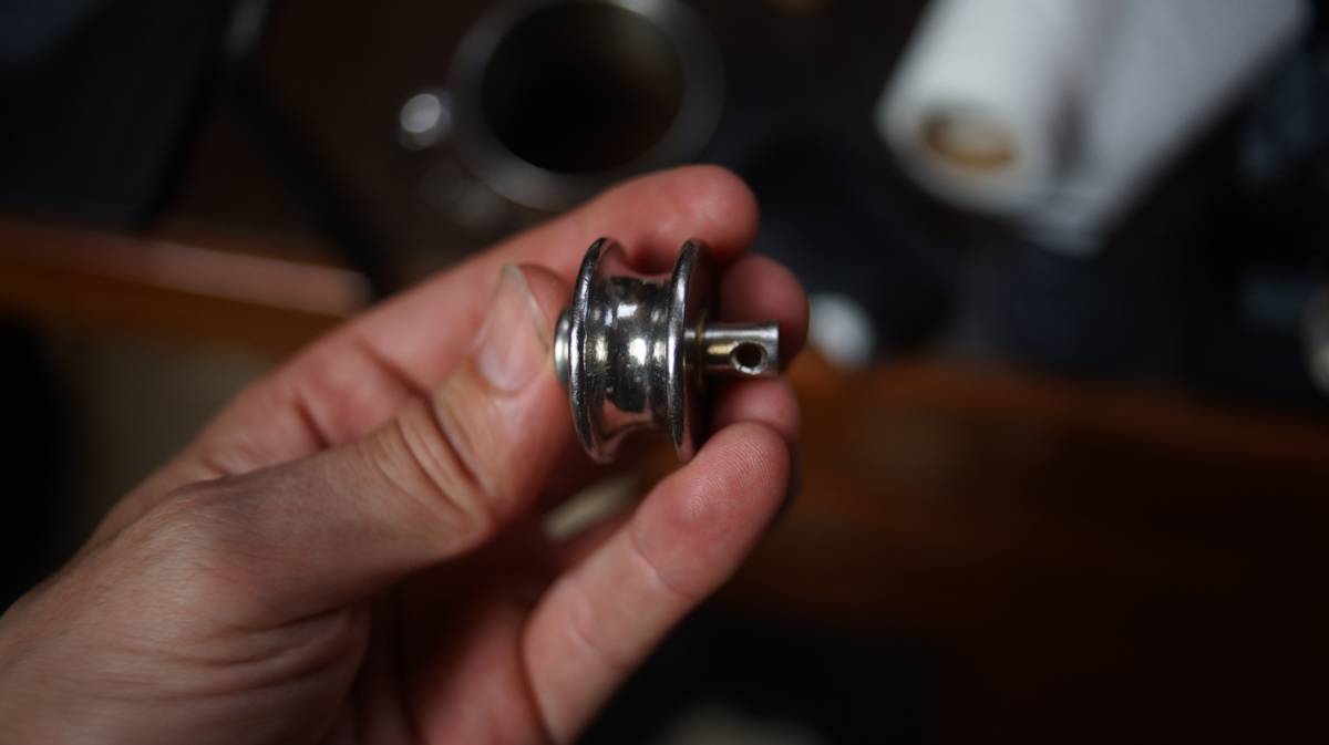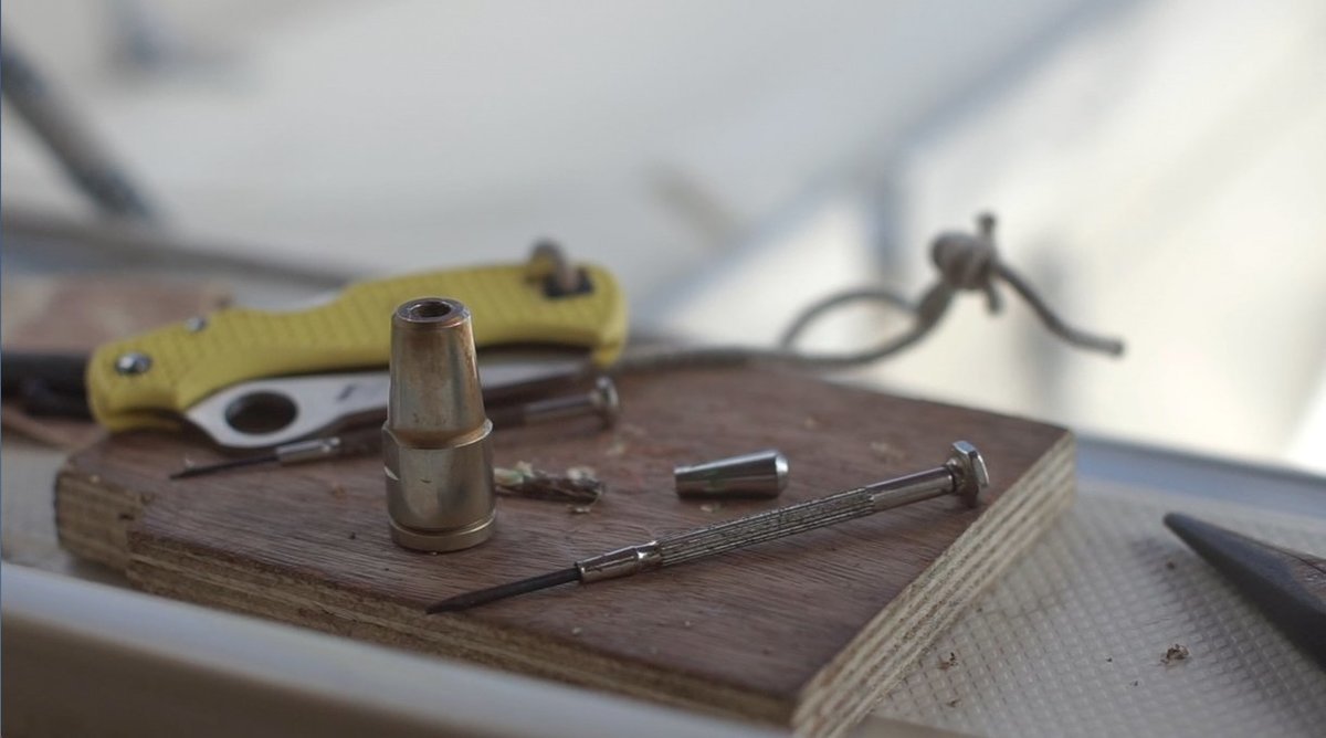 The issue with replacing the intermediate shrouds though, was that the T-terminals they had were too big to fit in the backing plates of our mast. A t-terminal is a piece at the top or end of the wire, shaped like a T (as the name suggests), that fits into a backing plate that is attached in your mast with rivets (a permanent mechanical fastener). The backing plate is in a hole, in your mast, and has a little elongated slot for the T to fit into, it fits at an angle and when turned the little arms of the T keep it in place.
