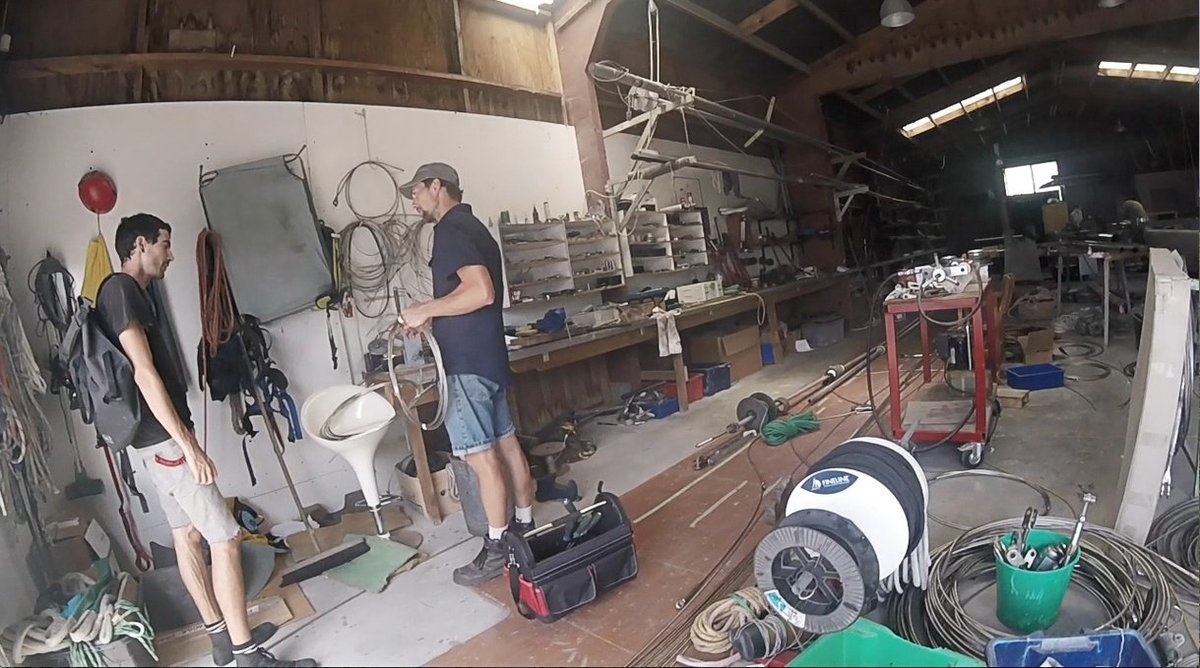 While in Tonga, our friend Alex came over to talk to us, and standing in his dinghy from the water, noticed a cut in our port side intermediate shroud. An intermediate shroud is one of many wires that are holding up the mast. This one, leads above the second spreader (a spar that deflects the shrouds) on the side of the mast. Our boat has two sets of spreaders, because we have a very tall mast — not everyone has intermediate shrouds. The cut was just near the lock (the part that squeezes, and connects the wire to the turnbuckle), a single cut in one of the strands. This was bad news. We had it fixed, temporarily, cutting the wire and adding a second turnbuckle — with Herbert's help (thank you sensei). We needed to fix this, and while in Whangarei, thought we'd replace the port side intermediate and the backstay (a wire from the mast that leads to the back of the boat) as well.