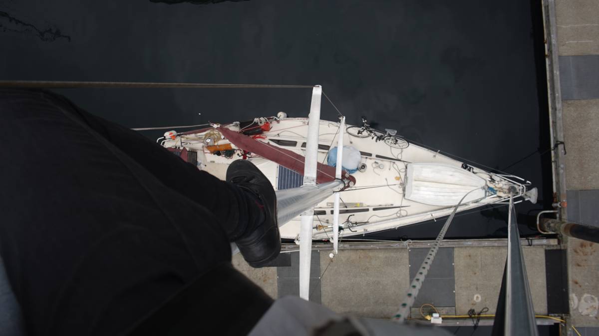 The backing plate was installed again, but it took some time before we could do that. We needed an air compressor, to use a gun to get them back on there. As it turns out, our rivets are big, and doing it by hand is near impossible - on a pile mooring, there was no way to power that compressor. We waited till our haul out to do it, since C-spar was at that yard, and that they could bring the compressor there to do it. This is what happened. Daniel climbed up the mast while the boat was on hardstand, this wasn't our idea, but then again, the cradles were made strong, better than how they do it in BC. It seemed safe enough, there was little chance that the boat would tip over. It's always better to go up the mast while in the water, since the boat has righting ability, and won't risk tipping.