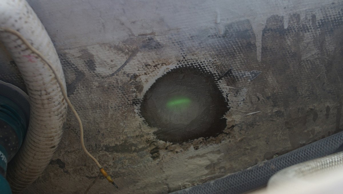 Pino's hull is thick fibreglass, thicker on the floor behind the keel (where the galley thru-hulls are located). We closed the macerator hole first as practice, then we moved on to close the other 3 in the head in one go.
