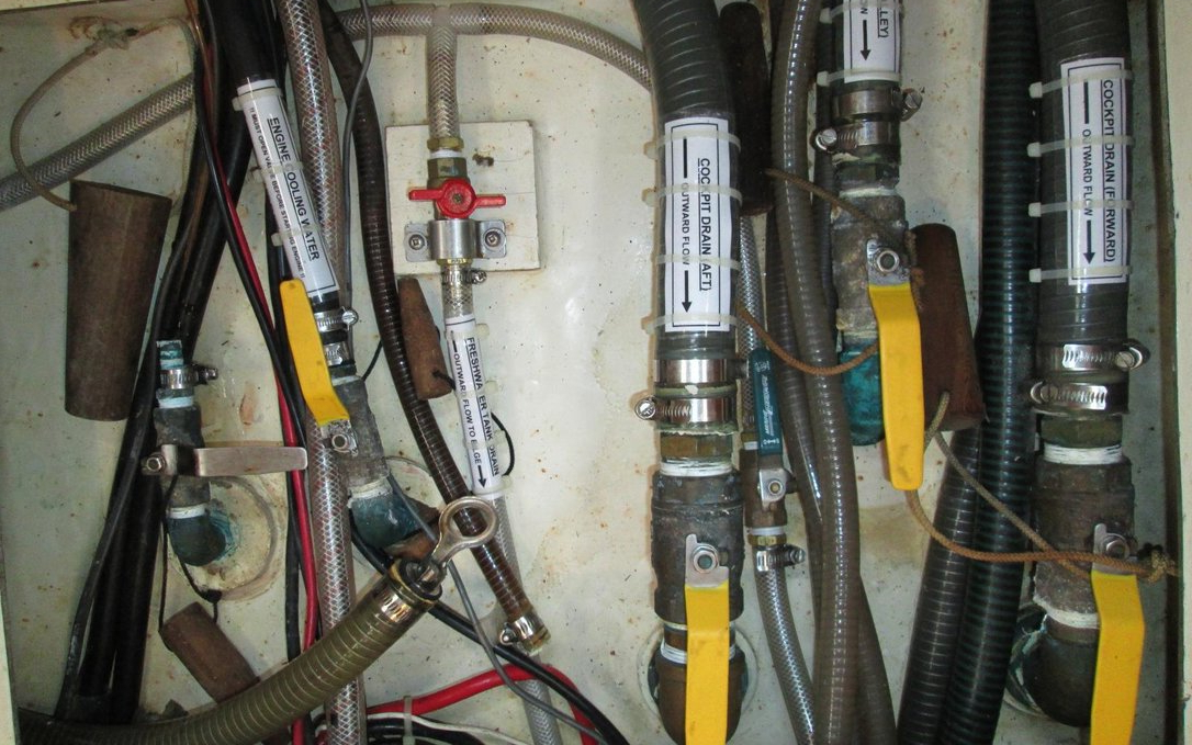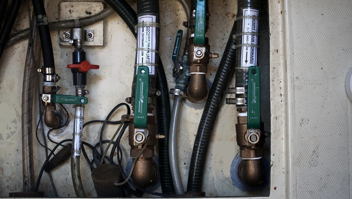 We closed 5 thru-hulls: the galley raw water sink intake (leftmost thruhull, first photo), head intake (second photo), head outtake (second photo), sink drain (second photo) and macerator.