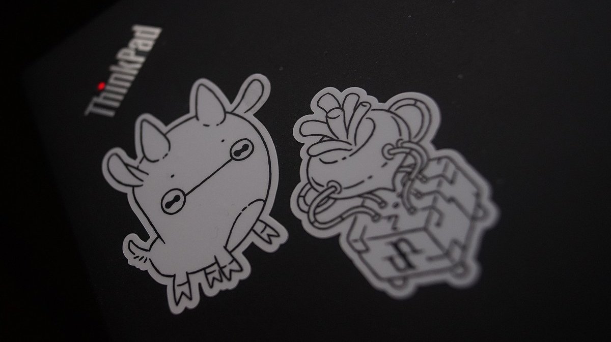 Stickers based on the mascot for the personal computing stack we designed, Uxn, and Varvara.