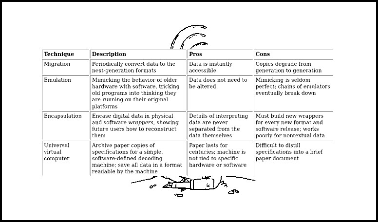 In the above image are four philosophies of digital data preservation, they all have their flaws. Data preservation is a somewhat new field, we don't know what sort of data we'll be able to recover in a hundred years, but from the experiments that we've looked at, it doesn't look good. The BBC had a project where they were trying to mimic one of their longest lasting books, the Domesday book. It was written by monks a few hundred years ago. The BBC's thinking was that we still have this book today, we can still read it, do we have technology to make something like this? Is it possible to record our way of life today, so that people in a thousand years can see how we lived? They created the BBC Domesday, a disc that contained music, movies, and scientific papers. Then 10 years later, it was an unreadable, people forgot how to decrypt and decompile the disc. It seemed that there was no real way to preserve data long-term, and so we decided to try our own little experiment.