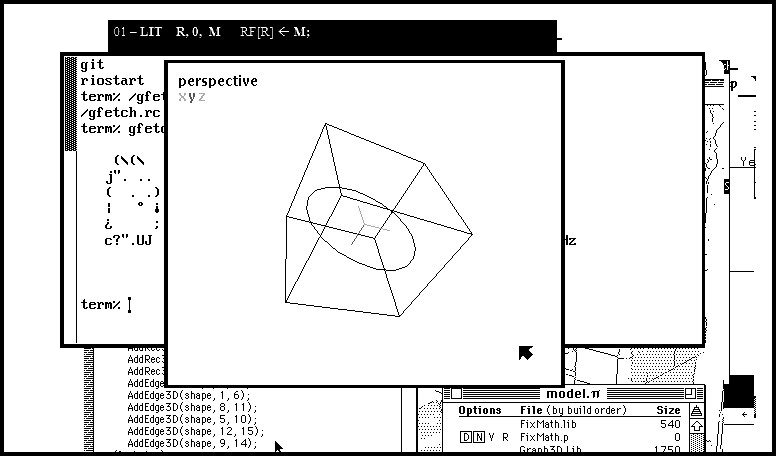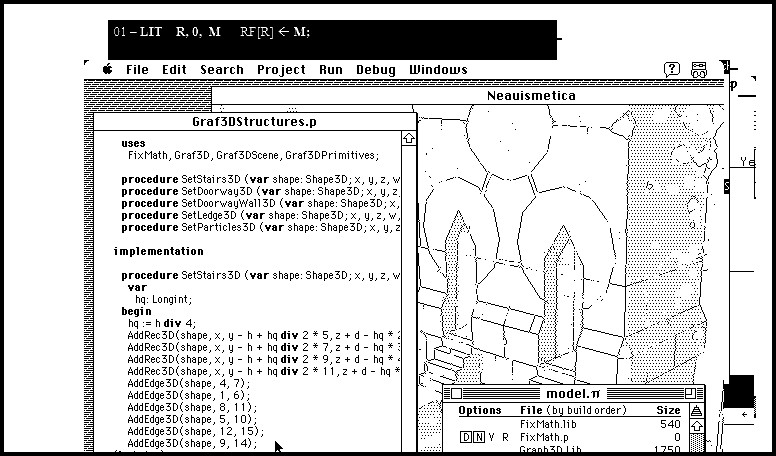 Pascal is a beautiful language. In the above image, I am running it in an emulator for the Macintosh. I loved that I could have a whole operating system running in a small window that wasn't Linux, that wasn't some big QEMU image. It was a little self-contained system, which I could destroy, or start over with really quickly. I could run it and do 3D at 60 fps by running the emulator at 128 times its speed, and thought that was cool, a testament to how fast computers are nowadays.
