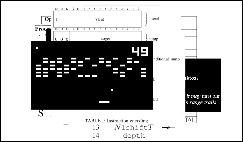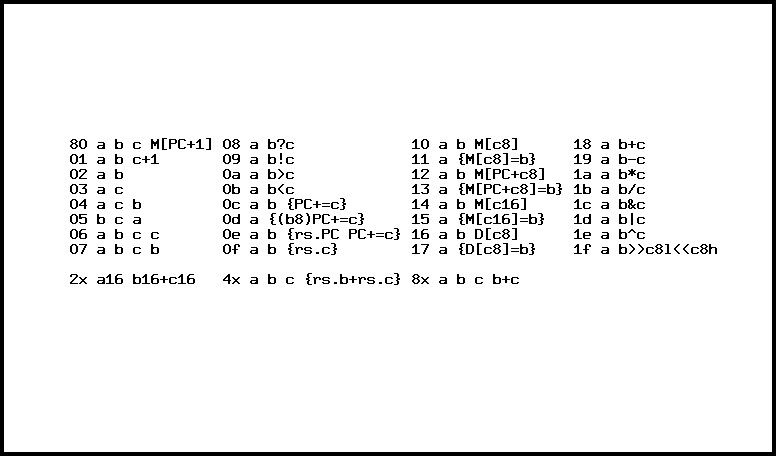 The spec is quite simple, it fits on maybe two pages of paper, side by side. It feels like the paper computer in ways that I like, but it was not designed to be a general purpose driving vm. It is meant to be building things in the scale of Pong. The keyboard is like a hex keyboard with just numbers on it. My plan was to build something that could build itself in it, so I'd need a keyboard, a cursor-a weird keyboard for me would not cut it.
