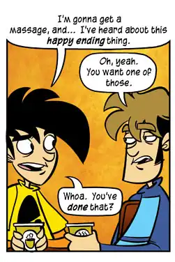 - At one point in A Dirty Job, the main character had too much "sexual energy". Even though he ended up at a massage parlour, he didn't ask for a "happy ending" but instead later went to an "official" hooker. This led to trouble, as the girl he chose turned out to be a crazy incarnation of Death. Even the cop who saved him said that he should have just chosen the happy ending.