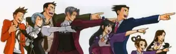 - ↑ Left to right: Larry Butz, Franziska von Karma, Dick Gumshoe, Miles Edgeworth, Maya Fey, Phoenix Wright, Pearl Fey, and Mia Fey.