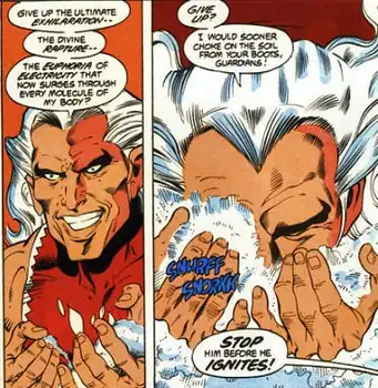 - The New Guardians villain Snowflame is the poster boy for this trope (he's the page image!), having actual observable supernatural abilities powered by cocaine, which he worships as a god.