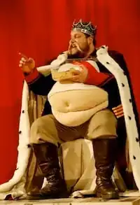 A very popular image in fictional works is to portray a King as tremendously fat. At a minimum, kings are considered corpulent, though more extreme examples will depict them as morbidly obese. This stems from the popular impression that a king spends his days sitting on his throne, feasting on the spoils from his taxation of the masses, or simply warming it while doing nothing.