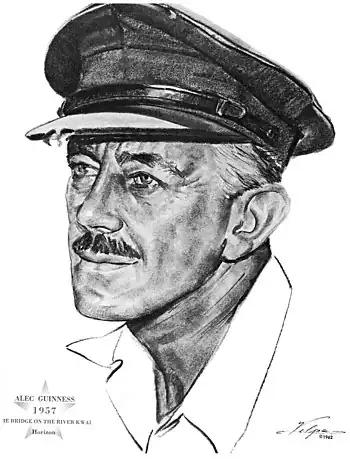 Sir Alec Guinness, CH CBE (2 April 1914-5 August 2000) was an English actor. After an early career on the stage he was featured in several of the Ealing Comedies, including The Ladykillers and Kind Hearts and Coronets in which he played eight different characters. He is also known for his six collaborations with David Lean: Herbert Pocket in Great Expectations (1946), Fagin in Oliver Twist (1948), Col. Nicholson in The Bridge on the River Kwai (1957, for which he won the Academy Award for Best Actor), Prince Faisal in Lawrence of Arabia (1962), Yevgraf in Doctor Zhivago (1965), and Professor Godbole in A Passage to India (1984). He is also known for his portrayal of Obi-Wan Kenobi in George Lucas’s original Star Wars trilogy, receiving a nomination for an Academy Award for Best Supporting Actor.