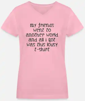 - In the Sailor Moon fanfic Isekai by Moonlight, two of the Sailor Senshi and their boyfriends are sent to Another Dimension. When they finally figure out how to return, they bring back souvenirs; Minako gets a t-shirt that reads "my friends went to another world and all i [sic] got was this lousy t-shirt".