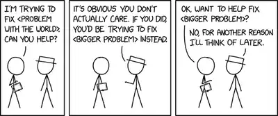 Arguing that expressing concern about a (relatively) small problem means that the person doesn't care about any larger problems. A type of Strawman, this fallacy takes the opponent's claim and appends to it the following additional claims: