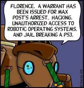 - Freefall: Max Post has an arrest warrant put out for him, in the March 25, 2011 strip, for hacking, unauthorized access to robotic operating systems, and jailbreaking a Play Station 3.