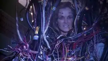 Alarms sound and a troop of security guards with Garibaldi, Bester and Dr. Franklin arrive at the evacuated Medlab. Inside, the woman is suspended in mid-air inside an intricate cocoon of wiring and is interfacing with the station's computers. She calls out to Bester for help, but when he approaches she spots his Psi Corps lapel pin and attacks them with electricity from the cables at her fingers. Dr. Franklin prepares a sedative injection and tries to reason with her, but can't get close. Bester is confused and tells Garibaldi that there is no reason for her to attack him. That makes Garibaldi realises that the reason for the attack might have been the sight of the Psi Corps insignia. He takes it from Bester and throws it to the floor, where she blasts it. She then speaks to them while Dr. Franklin approaches her slowly with the sedative: "Al, what have they done to me?" and sends him images of her ordeal: alien brain surgery and Shadow vessels.