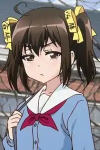 - Hair Decorations: Yellow ribbons tying off her Girlish Pigtails. Despite the picture, they don't normally have text on them -- that was a special "good luck" set for taking her entrance exams.