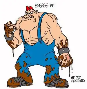 Limburger's rather dim-witted henchman who drips grease everywhere (hence the name). Limburger found him while searching for some big muscle to help him take over Mars... needless to say, Greasepit's resume was a little beefed up.