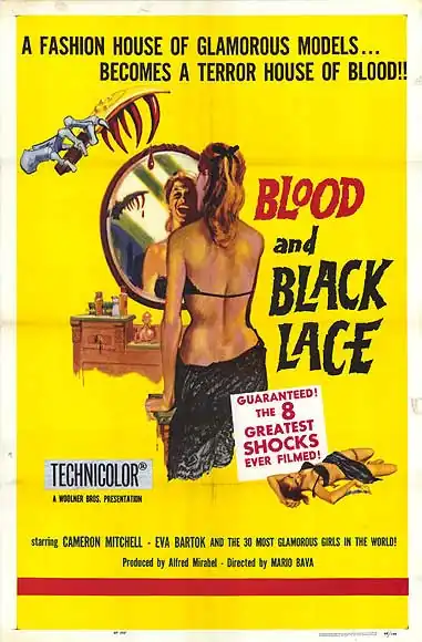 Blood and Black Lace (Italian: Sei donne per l'assassino) is a 1964 Italian Horror / Thriller Film directed by Mario Bava, who also co-wrote the screenplay with Giusseppe Barilla and Marcello Fondato. The film, starring Cameron Mitchell and Eva Bartok, concerns the stalking and brutal murder of several fashion models by a white-masked killer who is desperately attempting to recover the diary of Isabella, one of the models and the first victim, containing potentially scandalous information on the fashion house's various indiscretions, including abortions, blackmail, and drug addiction. It soon becomes a race against time as the diary changes hands repeatedly, separately pursued by the police investigating Isabella's murder, and the mysterious figure who is willing to kill to prevent its secrets from being revealed.