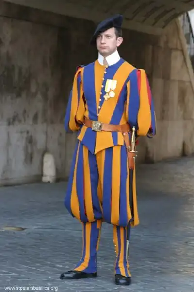 - Possibly the Western Trope Codifier: La Guardia Svizzera Pontificia oggi (one of whom is pictured above), the Swiss Guards which protect the Pope. The silly pants may make them seem a little like Bunny Ears Lawyers, but they were a terror on the battlefield in the late 1400s to early 1500s, and retain their tradition faithfully. And while they look silly, anyone trying to do harm to His Holiness will come to realize, to their detriment, that they are highly trained military professionals; they have all completed basic training with the Swiss Army, are chosen according to exacting standards of physical fitness, and are given further training once they arrive in the Guards. And although they are most often seen with their ceremonial weapons (swords and halberds) for guard duty, this is in reality their version of the 18th-century uniforms worn by the British Royal Guards; when actually guarding the Pope, they carry the standard-issue weapons of the Swiss Army: the SIG Sauer P220 handgun, the SIG SG 550 assault rifle, and the MP5 submachine gun.