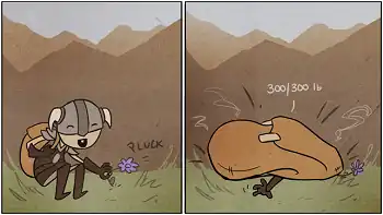 - Parodied at the beginning of Pyramids when Teppic chooses the gear he plans to take on his final examination. He has no problem adding to the hardware that he's carrying, but when he finally finishes making his selections, he falls over due to the weight.