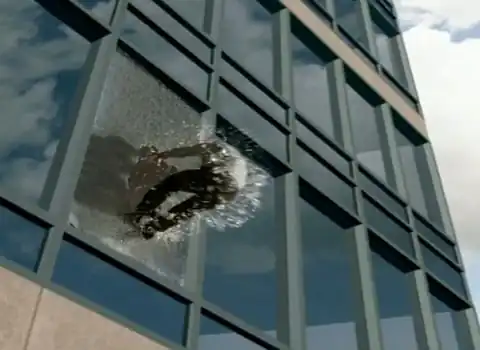 - In the MacGyver episode "Phoenix Under Siege", the villain of the week happens to be a martial arts expert and makes a jump-kick at our hero in a high-rise building, but misses and ends up crashing through the window instead.