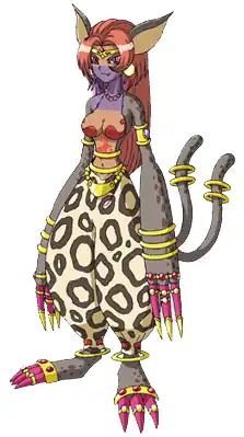 - Bizarre Sexual Dimorphism: By itself, their difference in appearance isn't that odd. No, it's bizzare in that it's the first example of this trope existing without being a case like Angewomon or LadyDevimon, a different digimon whose a variant on a male-looking one.