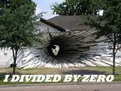 To divide a number by zero is the one thing elementary math teachers tell you[1] that you simply cannot do (but as usual, Real Life is more complicated than elementary school; see the Analysis subpage). It led to a joke on Image Boards [2] that if someone were to divide a number by zero, it would break reality. Someone making a suggestion that is severely unlikely is often compared to this. When Time Travel is involved, usually results in a Time Crash (and a Fate Worse Than Death for all involved). An Eldritch Abomination is something whose very nature is continuous division by zero itself.