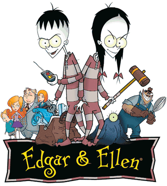 Edgar & Ellen is a series of children's books by Charles Ogden[1] that was adapted into an animated series. The title characters, a pair of 12-year-old twins, are notorious pranksters who cause mischief and mayhem in the town of Nod's Limbs. The two of them live in a thirteen-story house on the edge of town with their pet (named 'Pet'), a strange creature that vaguely resembles a one-eyed, hairy mop head. Their groundskeeper, Heimertz, lives in a shack near the house, never says a word, and wears a perpetual Slasher Smile. There is also a junkyard near the house where the twins get parts for the many unlikely contraptions that they build. Nod's Limbs itself is an overly cheerful town run by the inept Mayor Knightleigh. His daughter, Stephanie Knightleigh, is Edgar and Ellen's main rival in their quest for amusement.