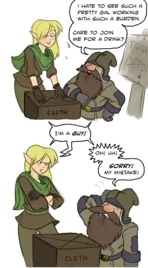 "So, you're into elves, huh? I guess I don't have to ask which one of you's the girl." |