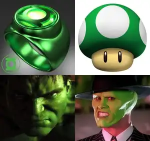 - ↑ Source Clockwise, from top left: The Green Lantern Ring, a 1-up mushroom, a person wearing The Mask, The Incredible Hulk.