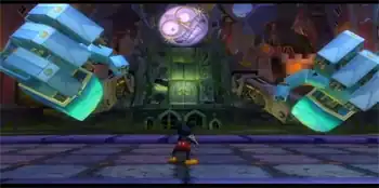 The smiling, golden-faced Clock Tower from the "It's A Small World" ride serves as the first boss. He'll try to flatten Mickey with his huge armored fists and arms.