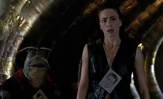 With everyone gathered in Pilot's den, John!Aeryn gives them all picture tags to hang around their necks so they know who is whom. Pilot!Chiana explains what he last remembers – Zhaan took a space pod out to the Halosian vessel, and the defense screen was damaged by the shot; it's in need of repair. Again. Pilot thinks that if they align the defense screen to 62% like it was during the first shot, they may switch back, so Crichton and Aeryn get to work. Meanwhile Tak agrees to go over to Moya to see that it she has no weapons, but Zhaan must stay as insurance.