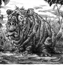 Perhaps the most famous of the bunch (and the subject of more than one popular song), the Squonk is a miserable animal, "The most melancholy of creatures", that allegedly inhabits the coniferous forests of northern Pennsylvania. Because its skin is covered in warts, blemishes, blisters and abrasions, the Squonk is disgusting to look at—and it knows this, which is why it hides underground during the day, hoping not to offend any other creature with its hideous appearance. At night, the Squonks all come out into the open and openly weep; the strange sounds lumberjacks and other frontiersmen heard in the forest at night were attributed to their crying.