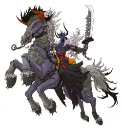 A knight riding a horse and armed with a blue sword, he can slay enemies with a single slash using "Zantetsuken".