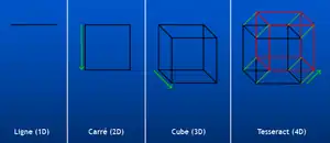 When my Grandson entered the room I carefully secured the door. Then, sitting down by his side and taking our mathematical tablets, — or, as you would call them, Lines — I told him we would resume the lesson of yesterday. I taught him once more how a Point by motion in One Dimension produces a Line, and how a straight Line in Two Dimensions produces a Square. After this, forcing a laugh, I said, "And now, you scamp, you wanted to make me believe that a Square may in the same way by motion 'Upward, not Northward' produce another figure, a sort of extra Square in Three Dimensions. Say that again, you young rascal." —Chapter 21. How I Tried to Teach the Theory of Three Dimensions to My Grandson, and With What Success