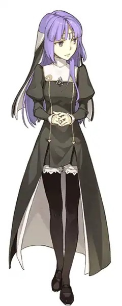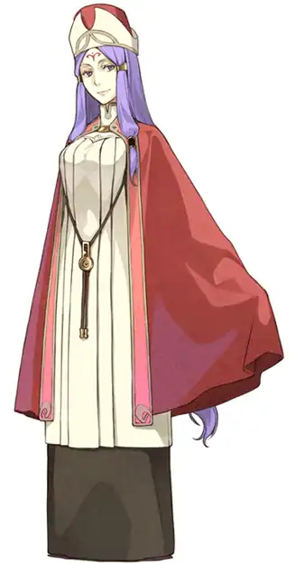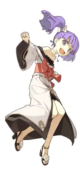 - Woman in Black: In her original character design, her temple priestess clothing was black instead of blue. Subverted in that her personality is neither dangerous nor menacing.