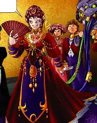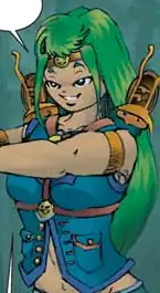 - Shapeshifter: She rapidly changes her hair and attire as a way of non-verbal communication; e.g. black dress and veil upon hearing of another God-Queen's demise, then shifting into that queen's shape (presumably) as a tribute to her achievements and memory.