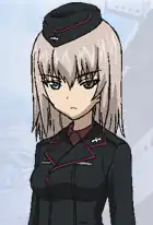 - Dressing as the Enemy: She does so for pre-match "reconnaissance" of Saunders, Anzio, and BC Freedom, and OVA 5 reveals she (and Erwin) do it during the match against Pravda. Hey, when the "Russkies" leave their overcoats and ushankas hanging up unattended, it'd be a shame not to use them.