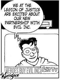 There's a Nebulous Evil Organization, often run by an Evil Overlord and chock full of Psychos for Hire and legions of mooks. And then one day, either as part of an Evil Plan or out of dire necessity, our heroes end up running it! Often they jump at the chance because now all those resources can be turned to good, or simply out of a belief that nothing else works: if you can't beat 'em, join 'em.
