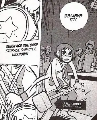 - Often used in Girly where Winter pulls out giant dildos and bazookas out of nothing, while Otra pulls out spaceships and her own armor with accommodating sword just like that. And one of their adversaries use the Hammerspace against them while referencing to this very trope. While using a hammer.